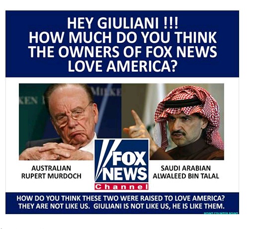 Mayor at the time, Rudy Guiliani, turned down 10 million dollars from Alwaleed Bin Talal to help rebuld 'Ground Zero' at New York, after the 9/11 attacks 'because an Arab can never be a true American patriot'. Well, he wás the second owner of your most trusted TV-channel. Until he sold his shares in Fox in 2017. If you wonder why so much on Fox News is repeated in the English tabloid The Sun, well, they are basically the same company. So, what do you think of the fact that a few of the most dominant media outlets are run by just one single (and foreign) family?